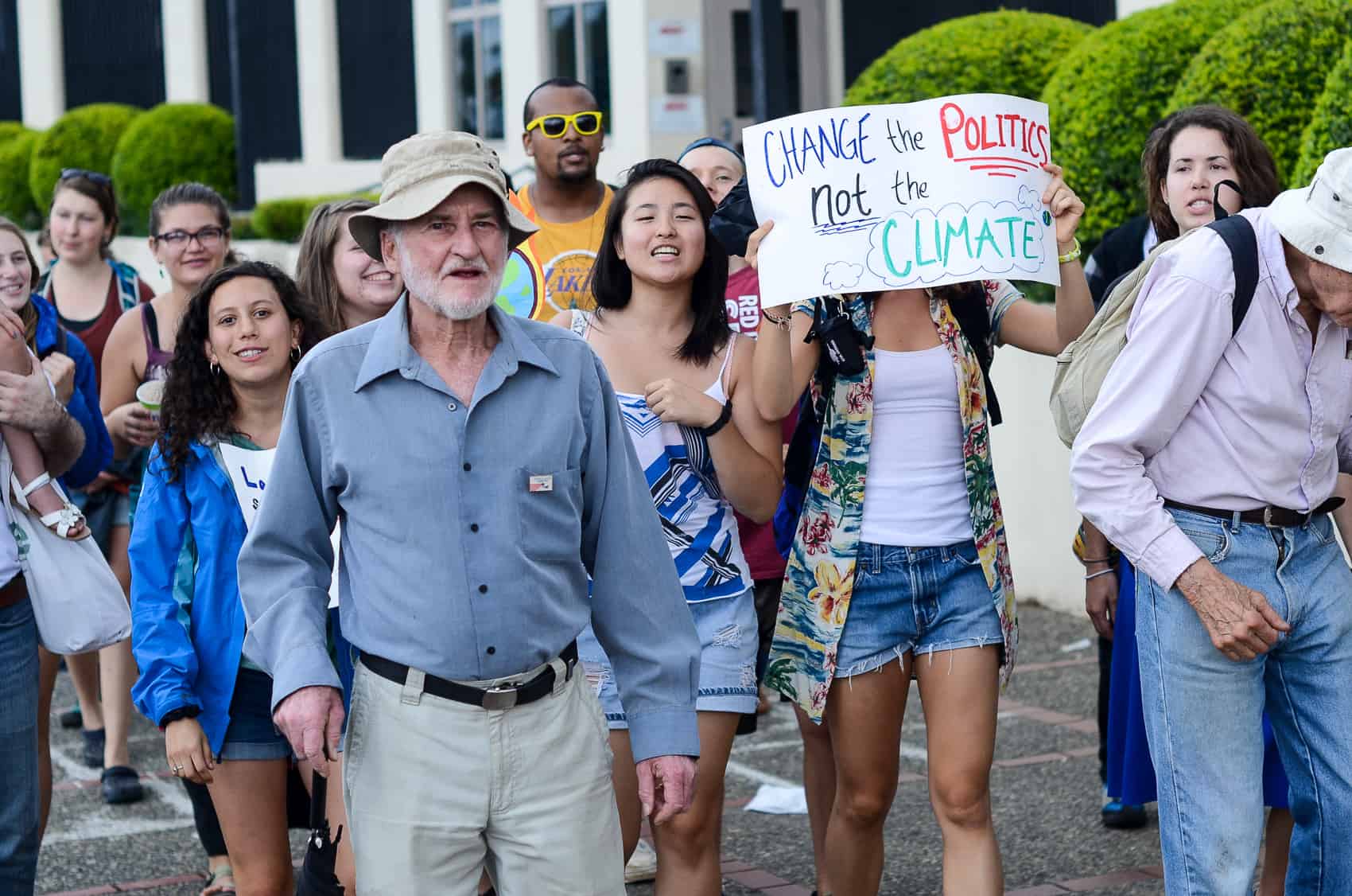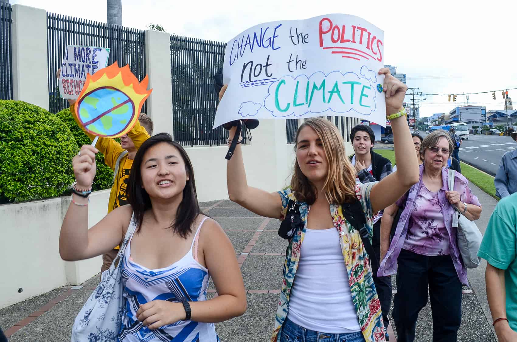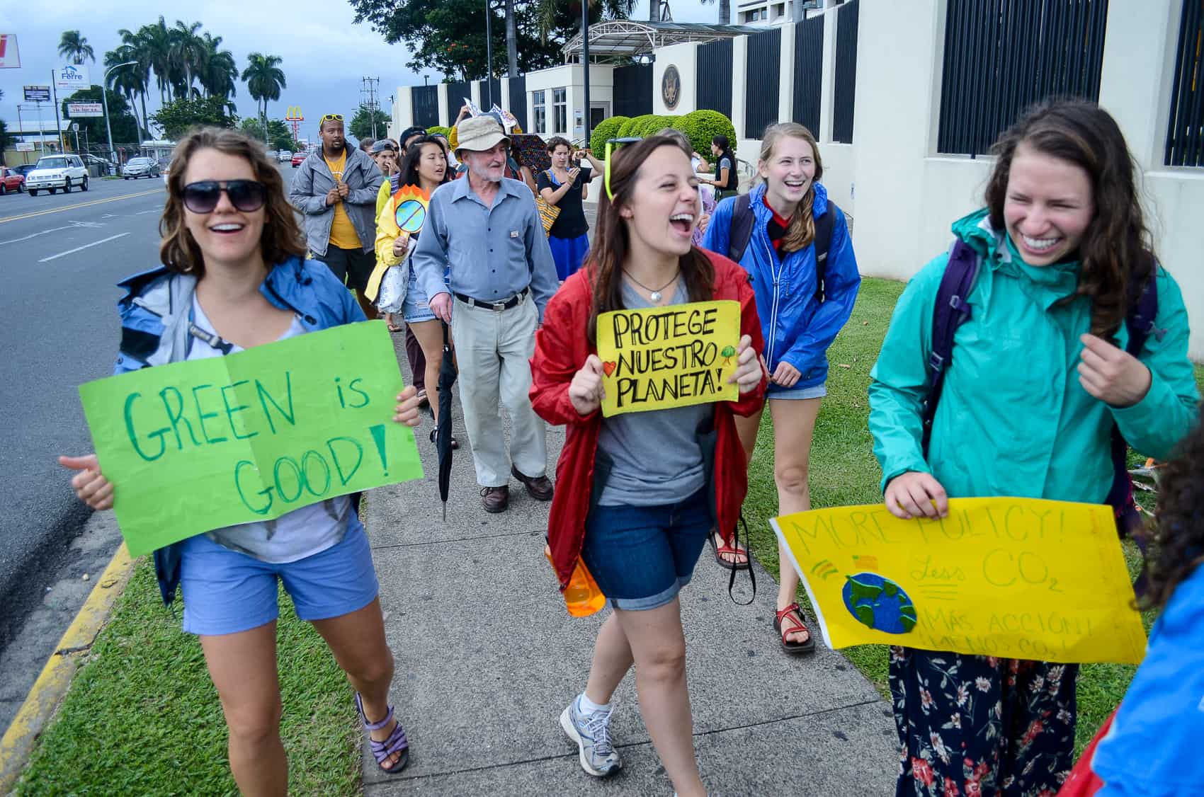 A small group of demonstrators, mostly from the United States, gathered in front of the U.S. Embassy in San José on Sunday afternoon to join a global rally to promote action on climate change.