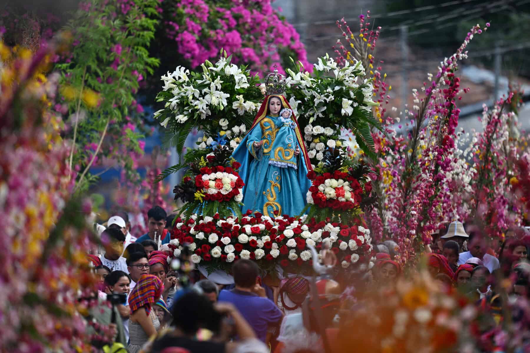 The people of Panchimalco, many of them descendants of the indigenous Pipil and Maya communities who settled here during the conquest, honor two patron saints, the Virgen del Rosario and the Virgen de la Concepción, through an elaborate procession that winds through the town’s steep cobblestone streets.